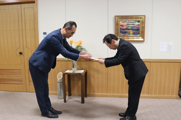 大分石油化学コンビナート代表山田(左)から大分県桑田副知事へ贈呈いたしました。(12月12日)