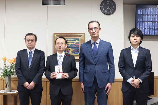 (左から)当社大分事務所長 北浦、桑田副知事、大分石油化学コンビナート代表 山田、大分県商工観光労働部 小田切部長